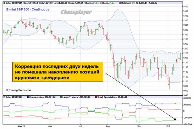 На рисунке внизу видно, что во время ралли сентября 2010- марта 2011 года крупные трейдеры накпливали шорты и выступали в качестве проигрывающей стороны.